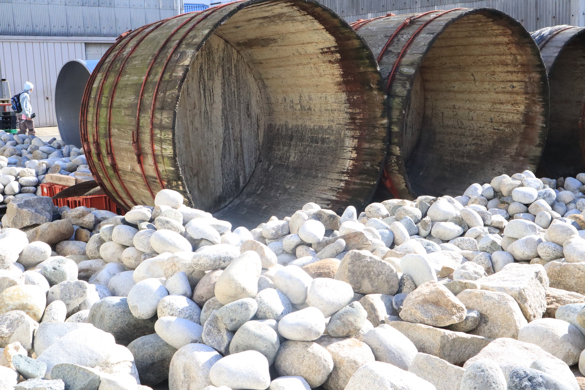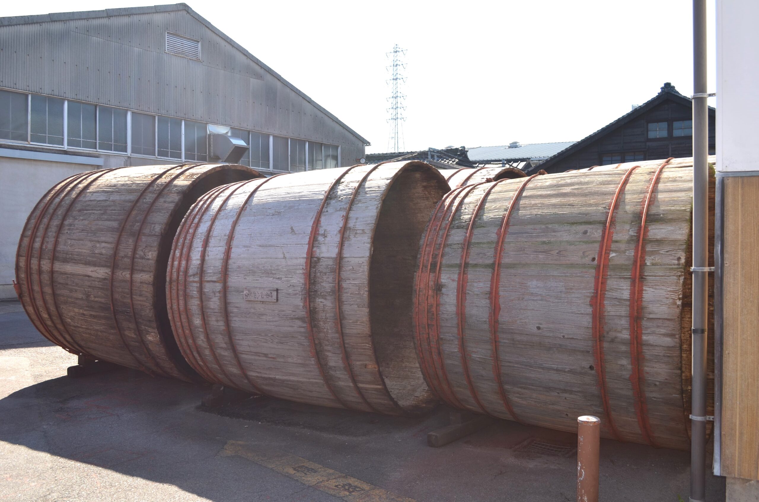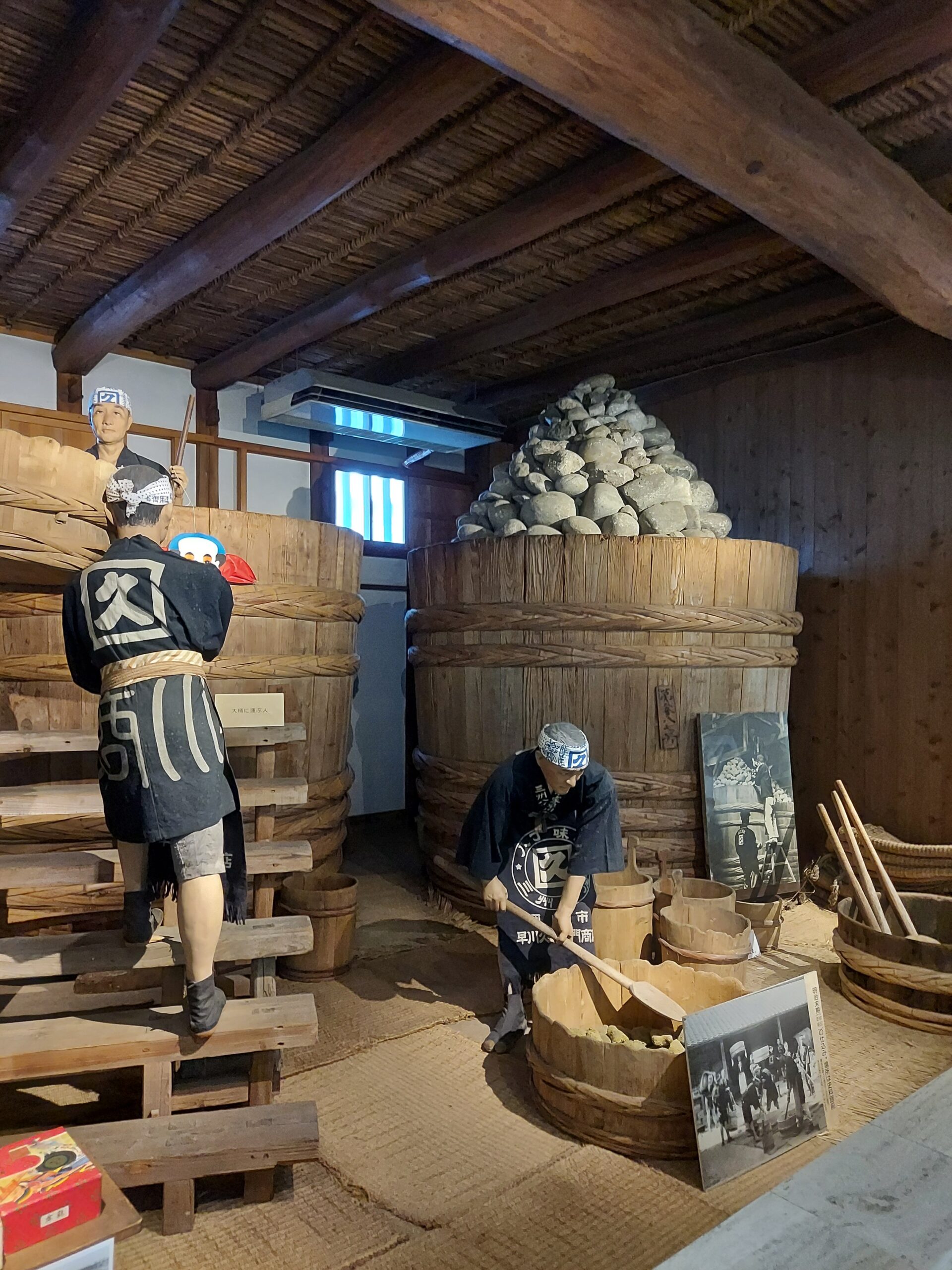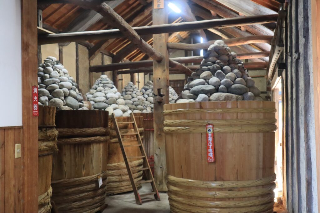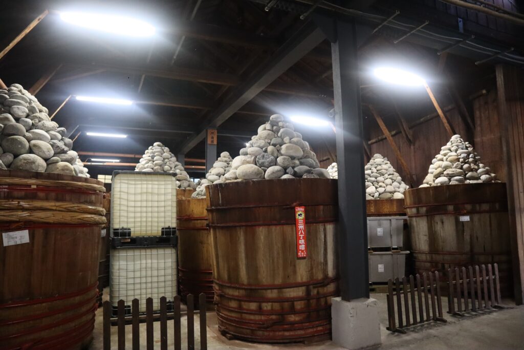 八丁味噌は、大豆と塩のみを原料に大きな木桶に仕込み二夏二冬(2年以上)天然醸造で熟成させて出来ています。1本の木桶には八丁味噌を約6トン仕込み、その上に約3トン、数にして約350個もの重石を積み上げます。